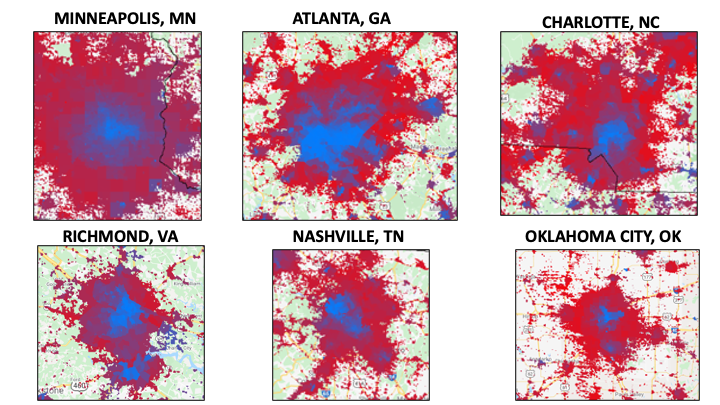 In the filtered map, the pattern we saw in Dallas can be observed consistently across the whole country. Huge expanses of red in rural areas are replaced with dots. Greater metropolitan areas become clearly visible, almost always exhibiting a blue center surrounded by a ring of red:
