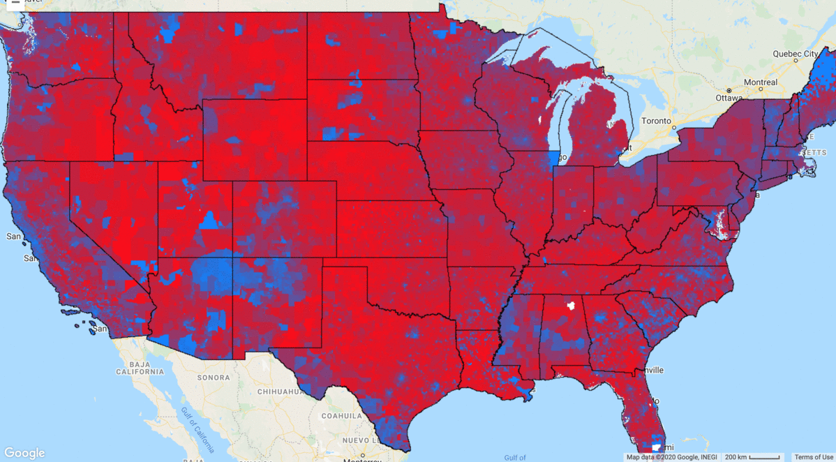 Poor map design has profound implications for how we understand the information they're trying to convey. The narrative that emerged as journalists tried to metabolize the 2016 election was that a groundswell of support from disaffected rural voters left behind by globalization carried Trump to victory. This is the narrative that jumps out at you from the standard county or precinct level maps: blue coasts, red heartland. It took several years, but the narrative that rural economic anxiety led to Trump's victory was eventually debunked when study after study concluded that suburban voters were actually the main demographic responsible for his victory.